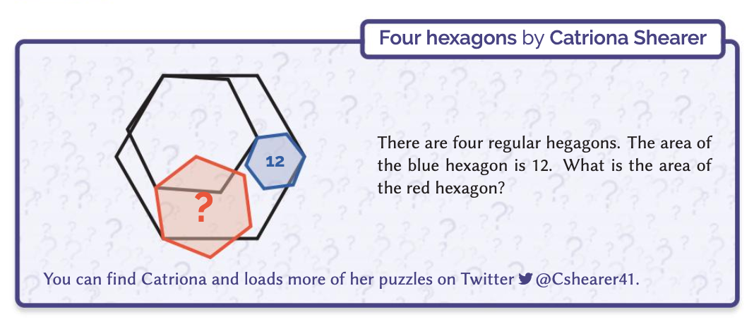 If you’ve read this blog for a while, you’ll know I’m a fan of @cshearer41’s puzzles (her book, Geometry Puzzles in Felt Tip, is available wherever etc). At a recent MathsJam, one jumped out of Chalkdust at us: