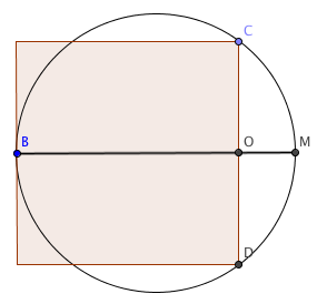 How does it help? Consider the diameter to the circle at the point where the square is tangent, $BM$ in the picture below. That’s a chord; so is $CD$, so $|CO| \times |OD| = |BO| \times |OM|$. If we assume for the sake of simplicity that the square has a side length of 8, then $|CO| = |OD| = 4$, while $|BO| = 8$. Using the theorem, $|OM| = \frac{8}{4} = 2$, so the diameter of the circle is 10 and the radius is 5.