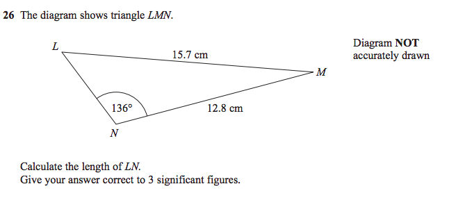 Side $LM$ is 15.7cm, $NM$ is 12.8cm, and angle $L\hat N M$ is 136º. While I think degrees are awful, they’re the angle currency at GCSE, so I’m stuck with them for this question.
