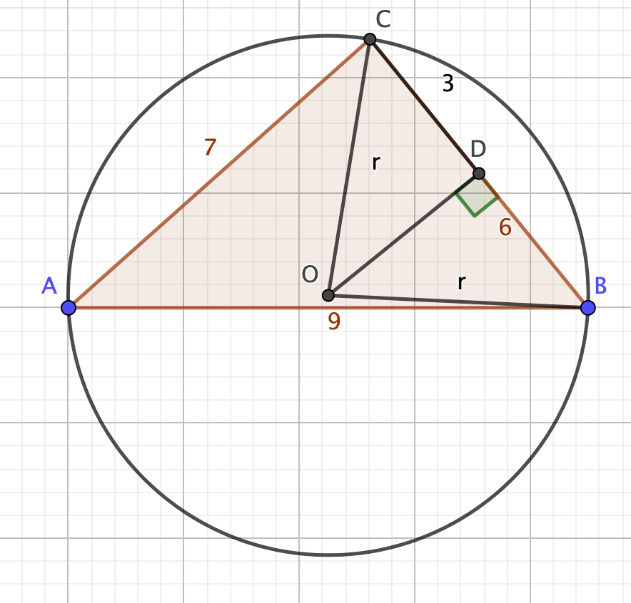 We have $\cos^2(A) + \sin^2(A) = 1$, so $\frac{3^2}{r^2} = 1 - \frac{47^2}{63^2}$.