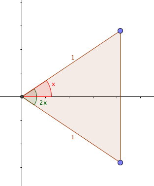 Now, the sides of the triangle are 1, 1 and $2\sin(x)$, at the base; the angles are $\left(\frac{\pi}{2} - x\right)$, $\left(\frac{\pi}{2} - x\right)$ (both at the base on the right) and $2x$ (at the apex on the left).