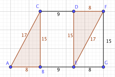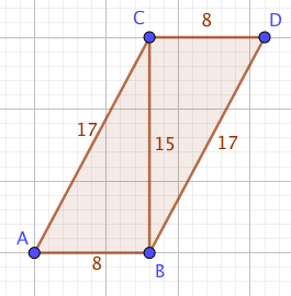 If you turn a copy of your triangle upside-down and put the length-15 sides next to each other, you get a… parallelogram, which isn’t quite what we need. The slanted sides are 17 units long, but the horizontal ones are only 8.