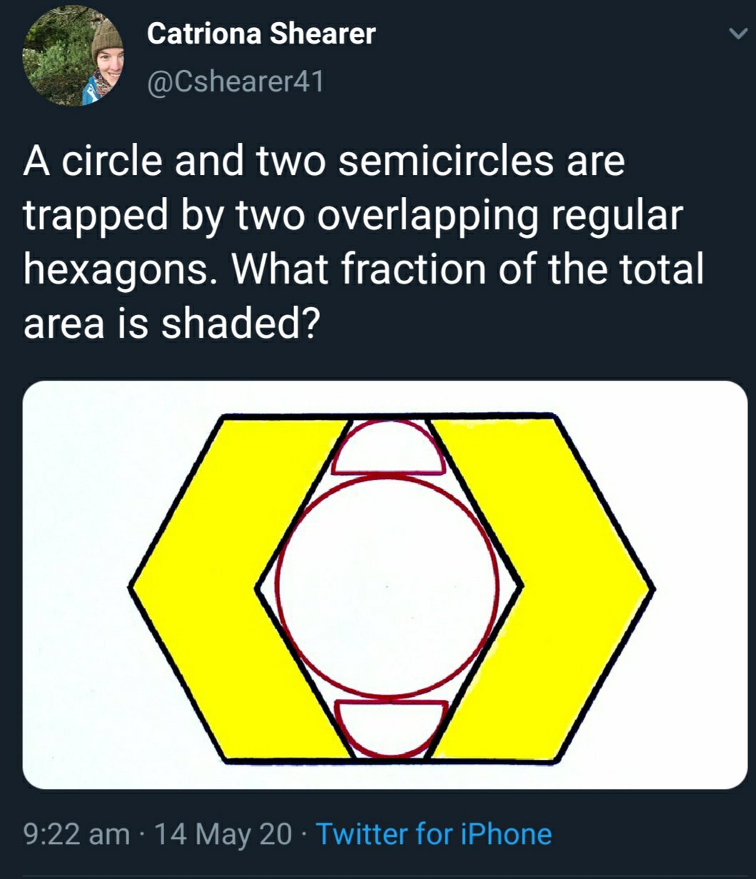I’ve only taken the top half because of symmetry; the proportion of the hexagon shaded in the bottom half is the same as that in the top, so I may as well just look at the top. (For a very similar reason, I’ve only labelled the left half.)