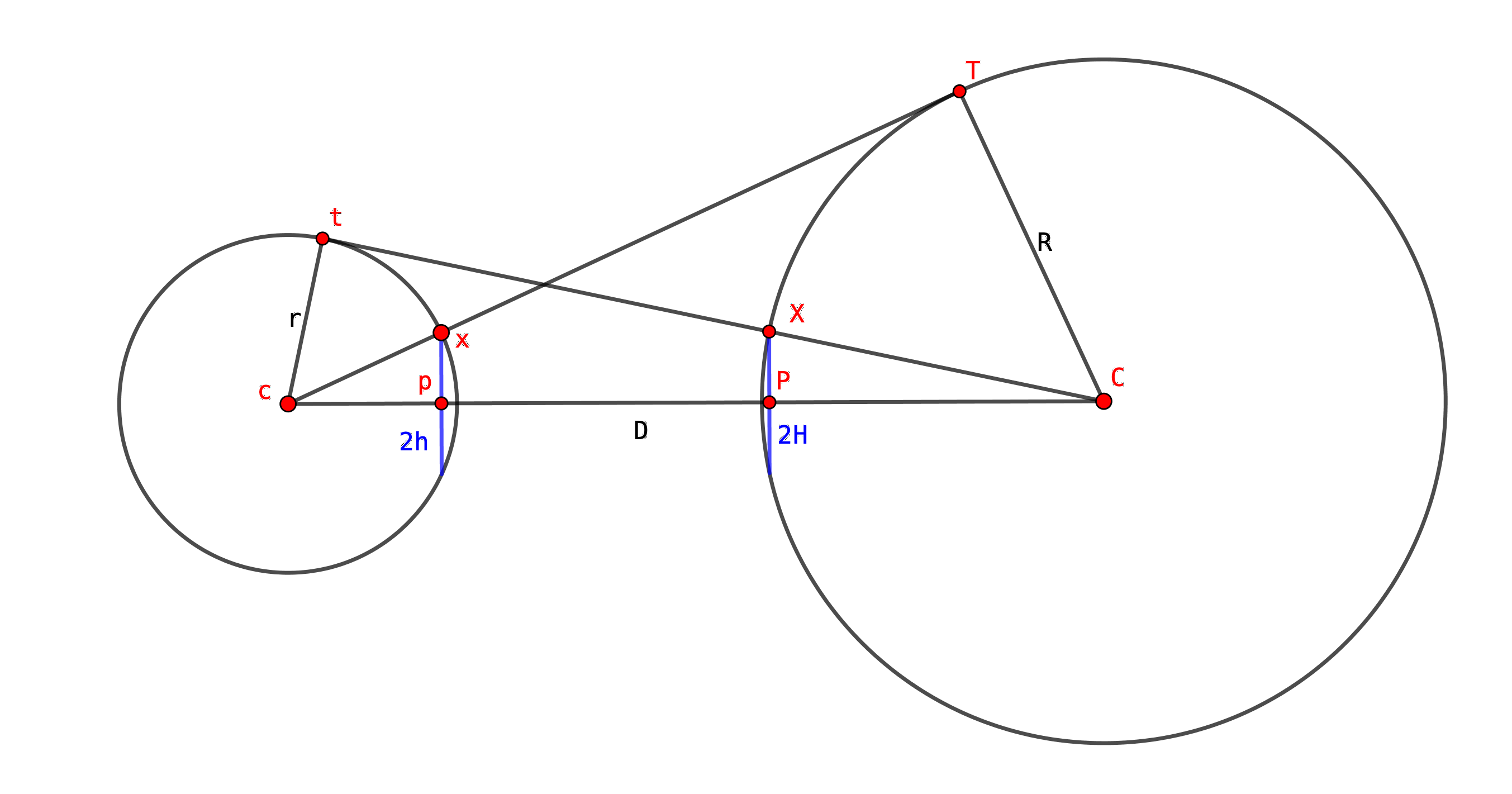 - Let the radius of the left-hand circle be $r$ and that of the right-hand circle be $R$. Let their respective centres be $c$ and $C$.