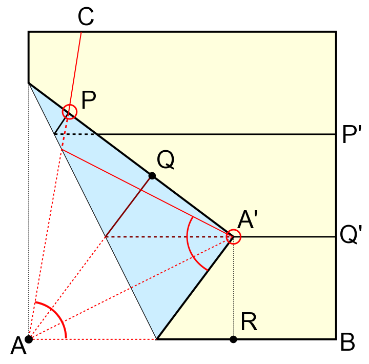 Here’s the clever bit: you now need to make a fold that makes point P lie on the original AC line, and point A on the line QQ’ (becoming point A’). It’s a bit tricky to get this right, but totally possible. Now, triangles APQ and AA’Q are congruent - they’re right-angled, they share the side AQ and PQ = A’Q because Q is midway between them. They’re also congruent to the triangle AA’R, because it is right-angled, shares the side AA’ with AA’Q and A’R = A’Q.