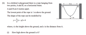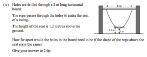 Part (iv) asks us to find the width of the seat on a rope that miraculously doesn’t change the shape of the rope, which is itself miraculously not following the catenary shape that dangling ropes generally follow. As Mark Twain almost said, when a rope behaves like that, it should be made to explain itself.