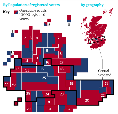 “Never mind how I’d do it: we can look at how some more reputable sources did. The FT do this curious circle thing - although it’s news to me that North Lanarkshire is to the north of Edinburgh. The Guardian splits each region up into squares representing 10,000 voters, which gives quite a clear representation.”