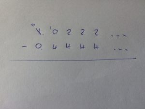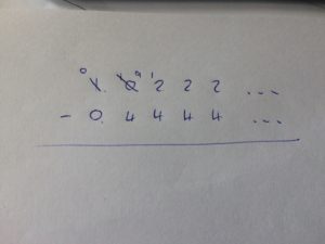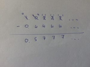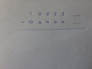 However, it spawned an interesting offshoot discussion with @richstakes, who asked “Can you subtract $0.\dot4$ from $1.0\dot2$ to get $0.5\dot7$? Where do you start?”