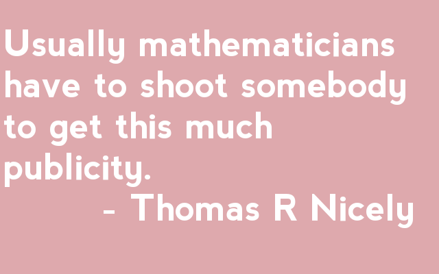 Quotable maths: Nicely Oct 11, 2012 [caption id=”attachment_1038” align=”alignright” width=”640”] Nicely discovered a flaw in the Pentium chip in 1994.[/caption] A selection of other posts subscribe via RSS