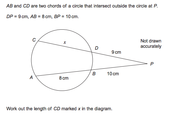 The examiners’ expectation was clearly that the student would know that PD:PA = PB:PC - and neither she nor I did. If you’ve learned the circle theorems by rote, congratulations: if you didn’t have this one on your list, you’re stuck. However, if you’ve played around with them, you’re in luck.