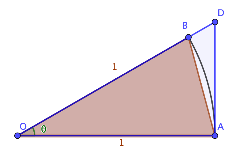- The largest is the blue triangle OAD, which has area $\frac{1}{2}\br{1}\br{\tan(\theta)}$ (treating OA as the base and noting that AOD is a right angle).